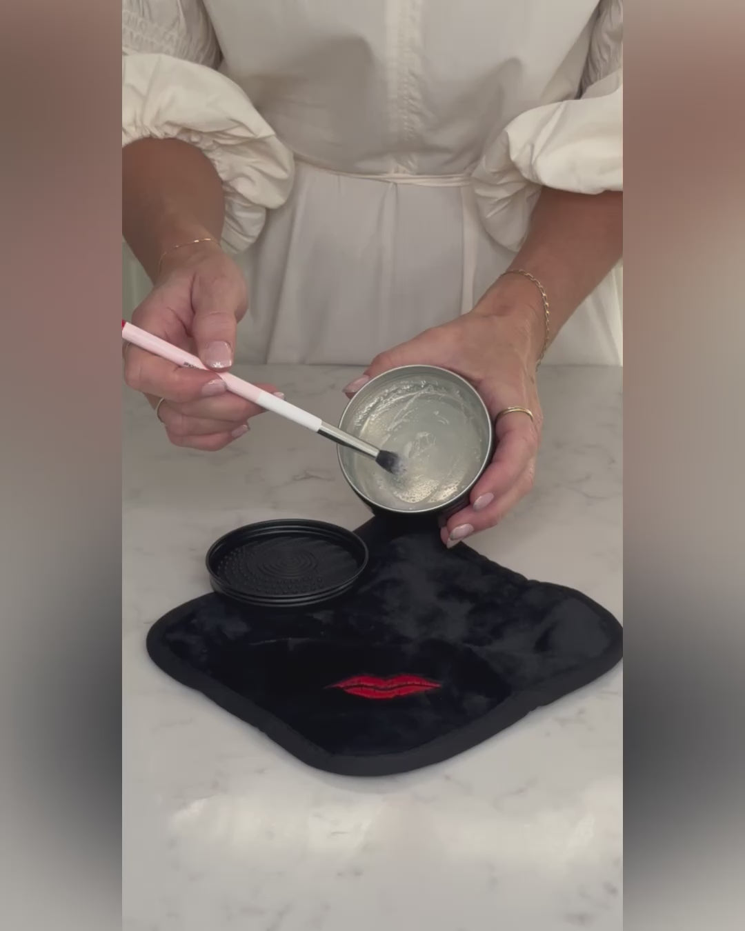 MODE D'EMPLOI : (voir aussi la vidéo ci-dessous) Il suffit de mouiller vos pinceaux dans de l'eau tiède et de tourbillonner autour du nettoyant, qui moussera et dissoudra les résidus de maquillage. Utilisez le tampon en caoutchouc souple dans le couvercle pour masser doucement vos pinceaux afin d'éliminer la saleté tenace. Rincer abondamment à l'eau, essorer délicatement avec le chiffon doux en microfibre et laisser sécher à plat.